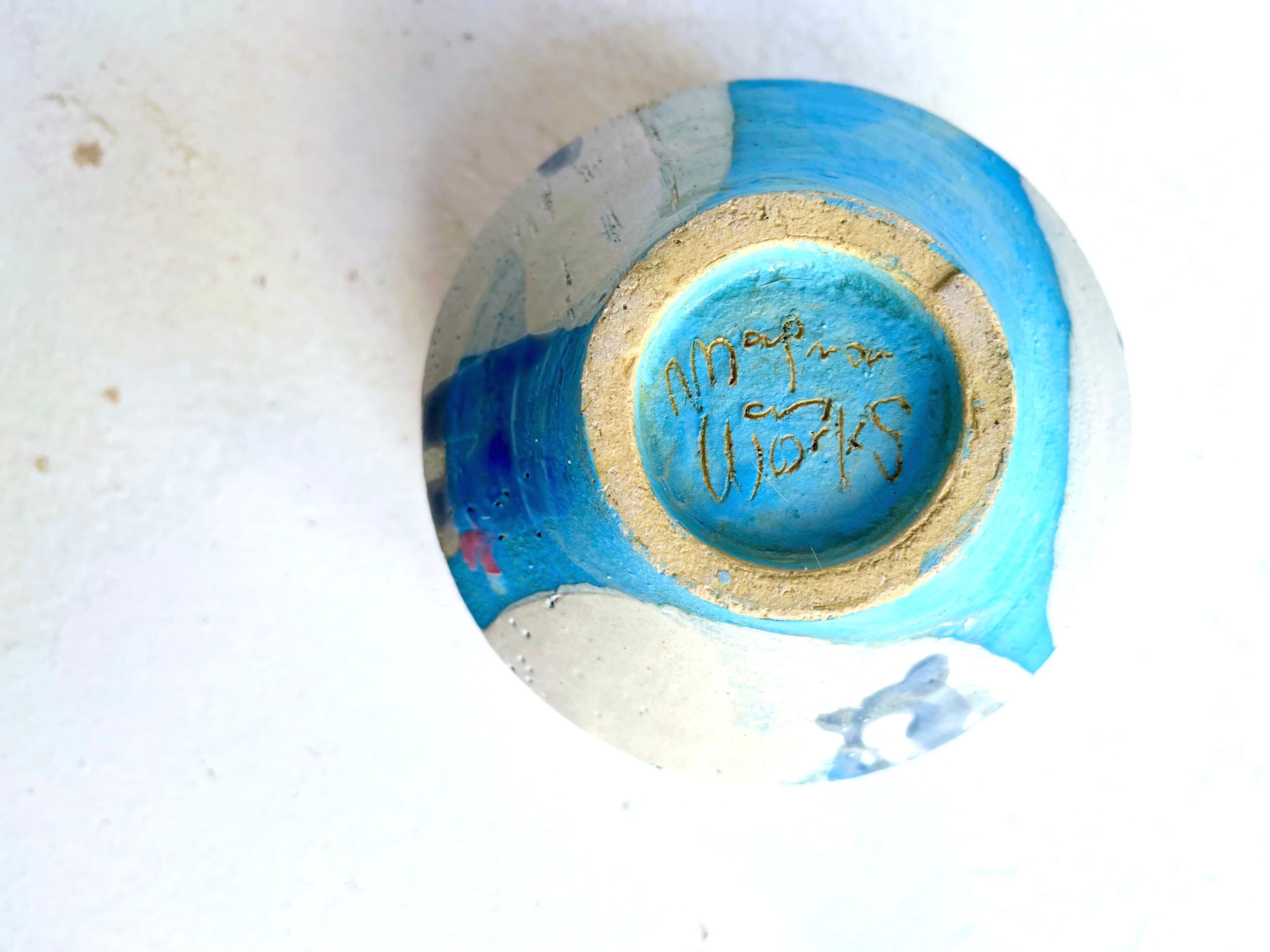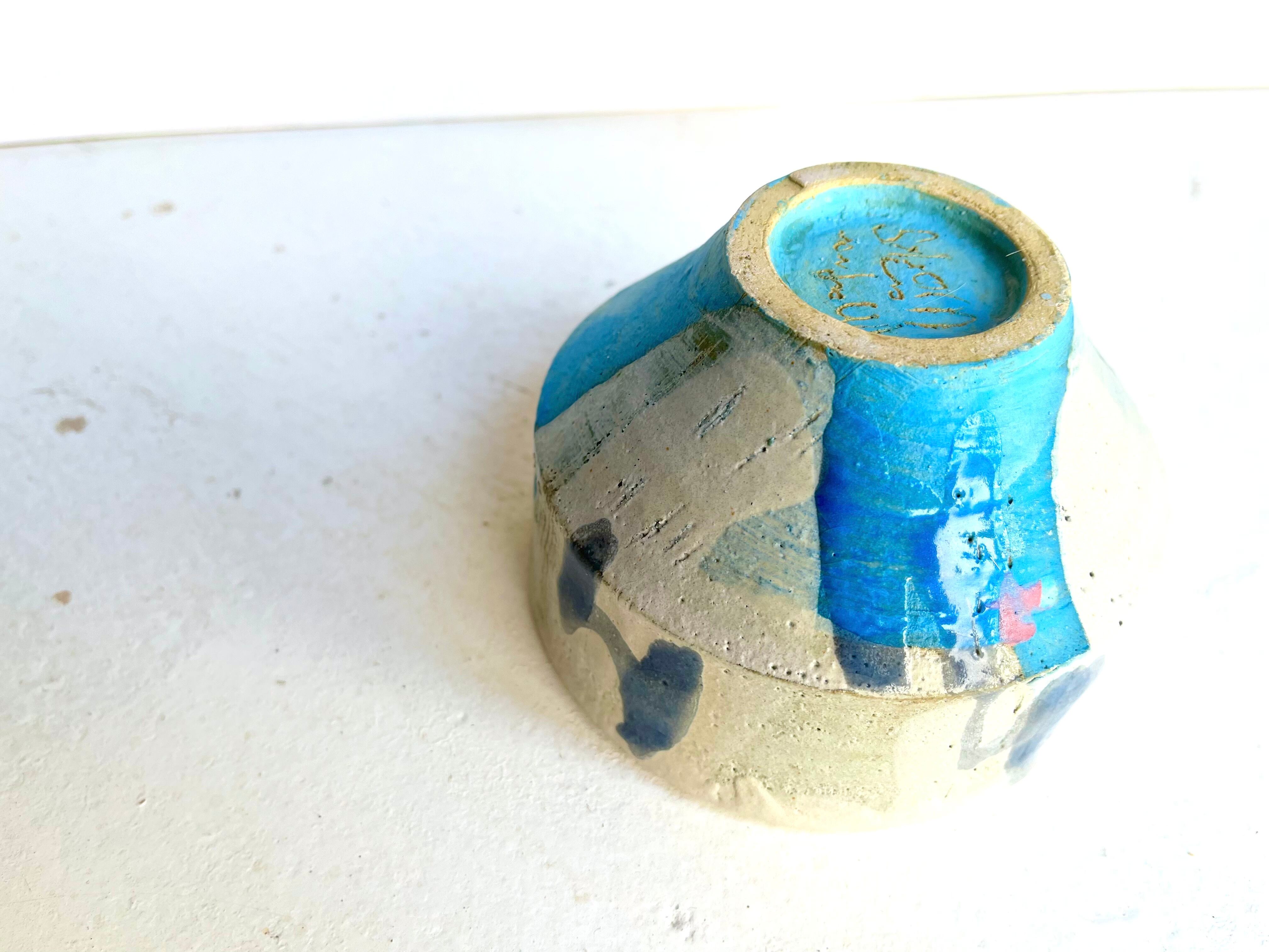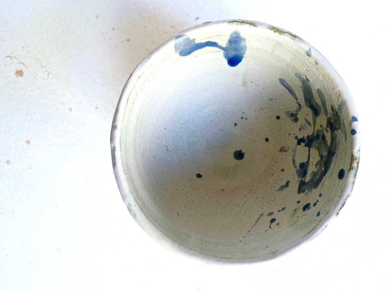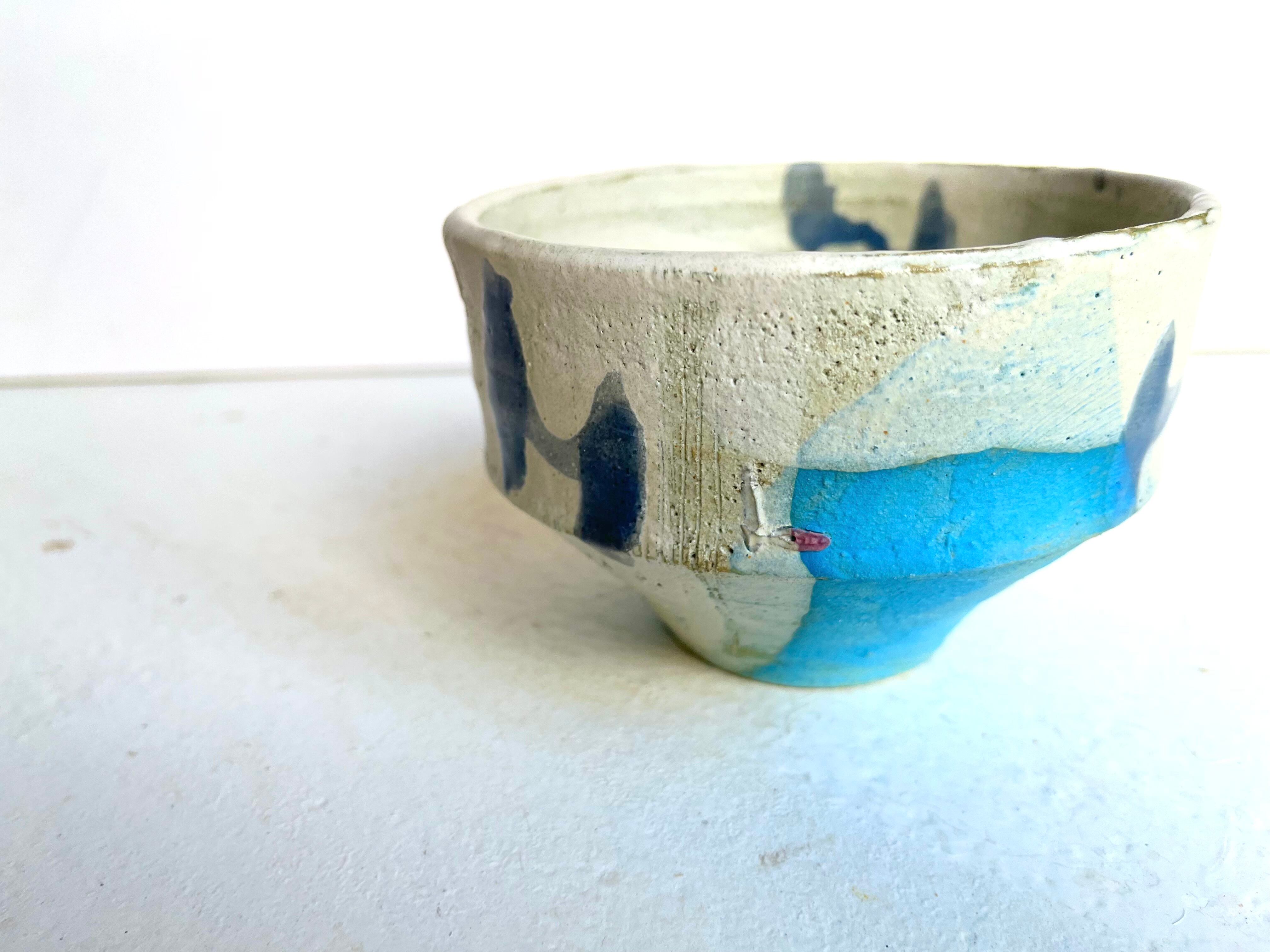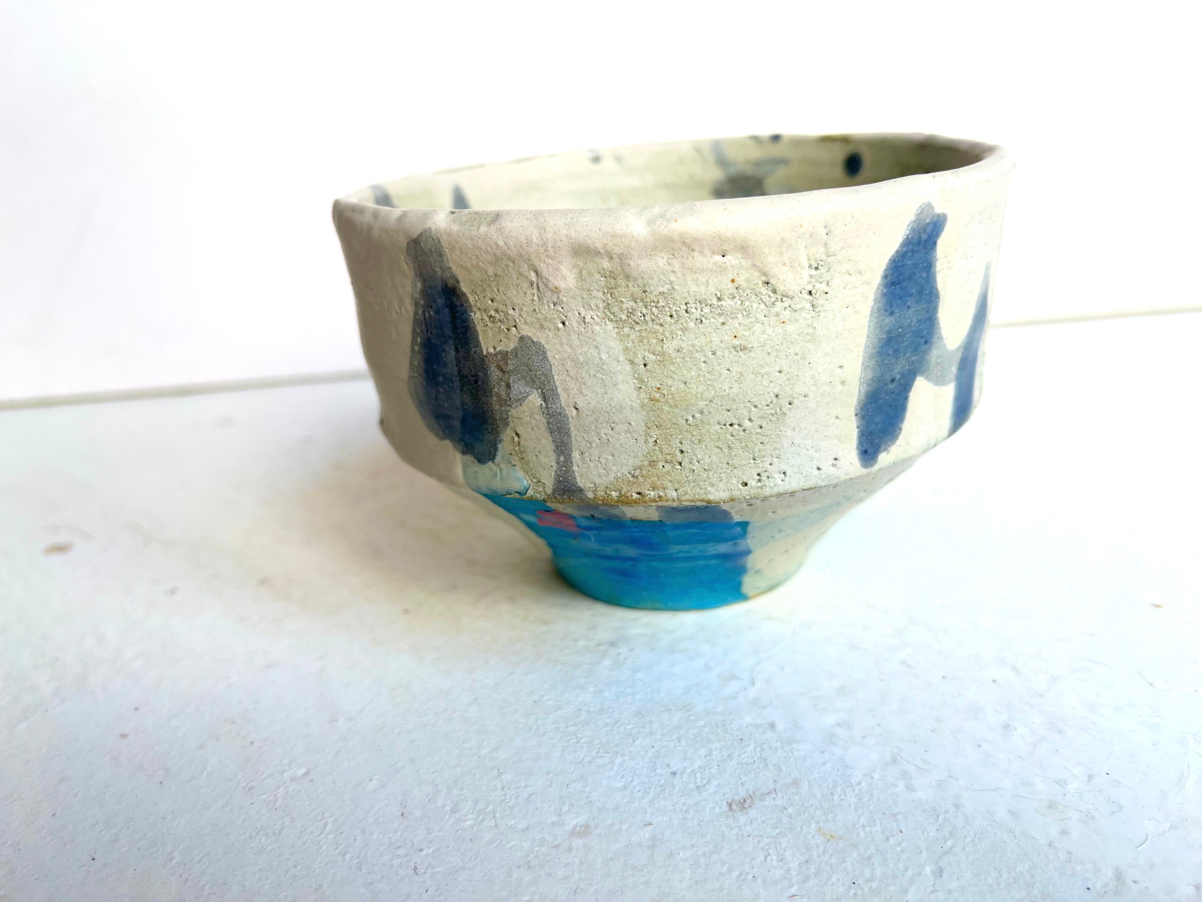 白の掛け分けの隙間から覗く水色が高台に、ピンクのドリッピング。