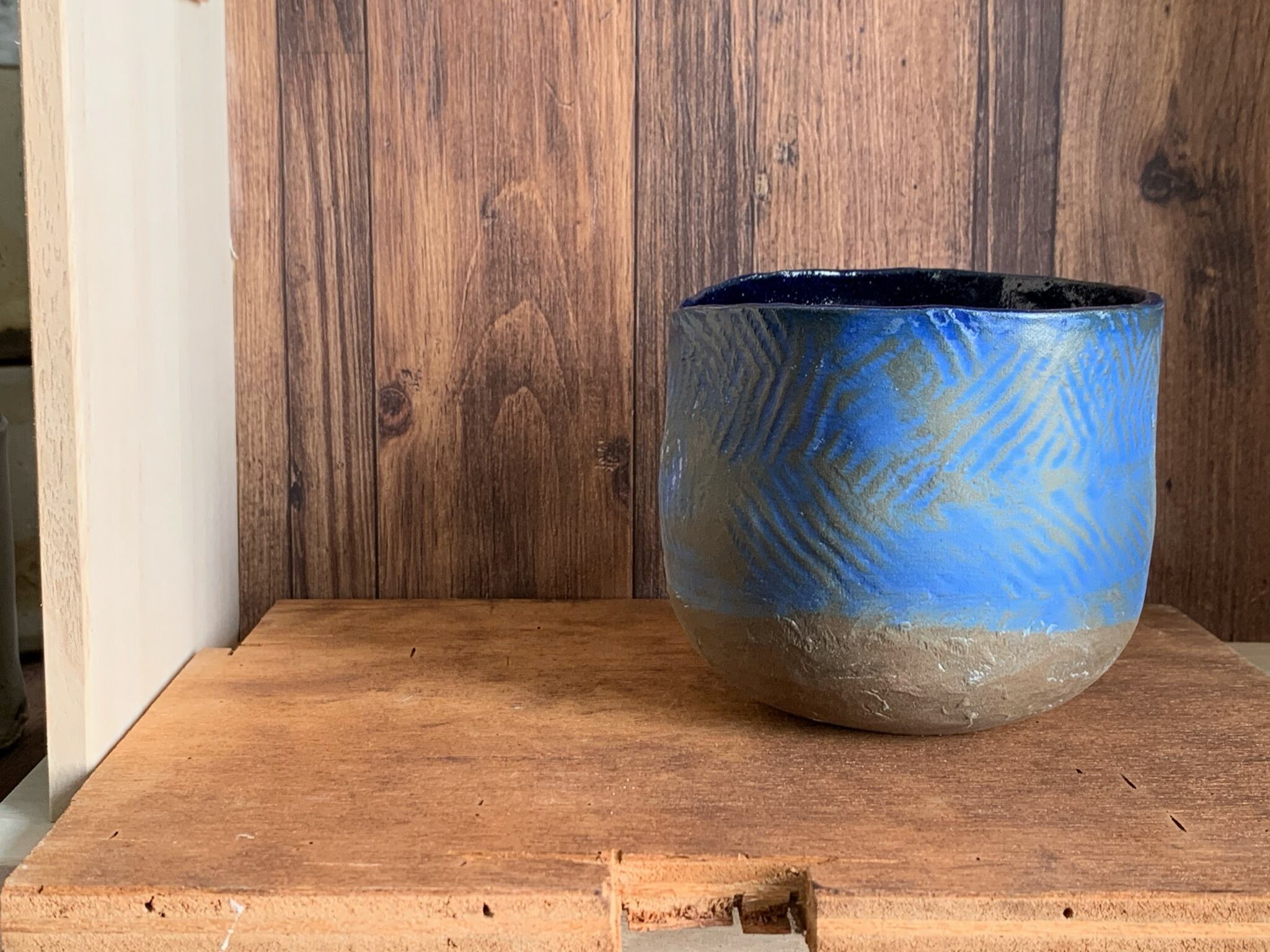 マットな青い土に縄文模様が施され、いにしえの土器を思わせるような肌触り。